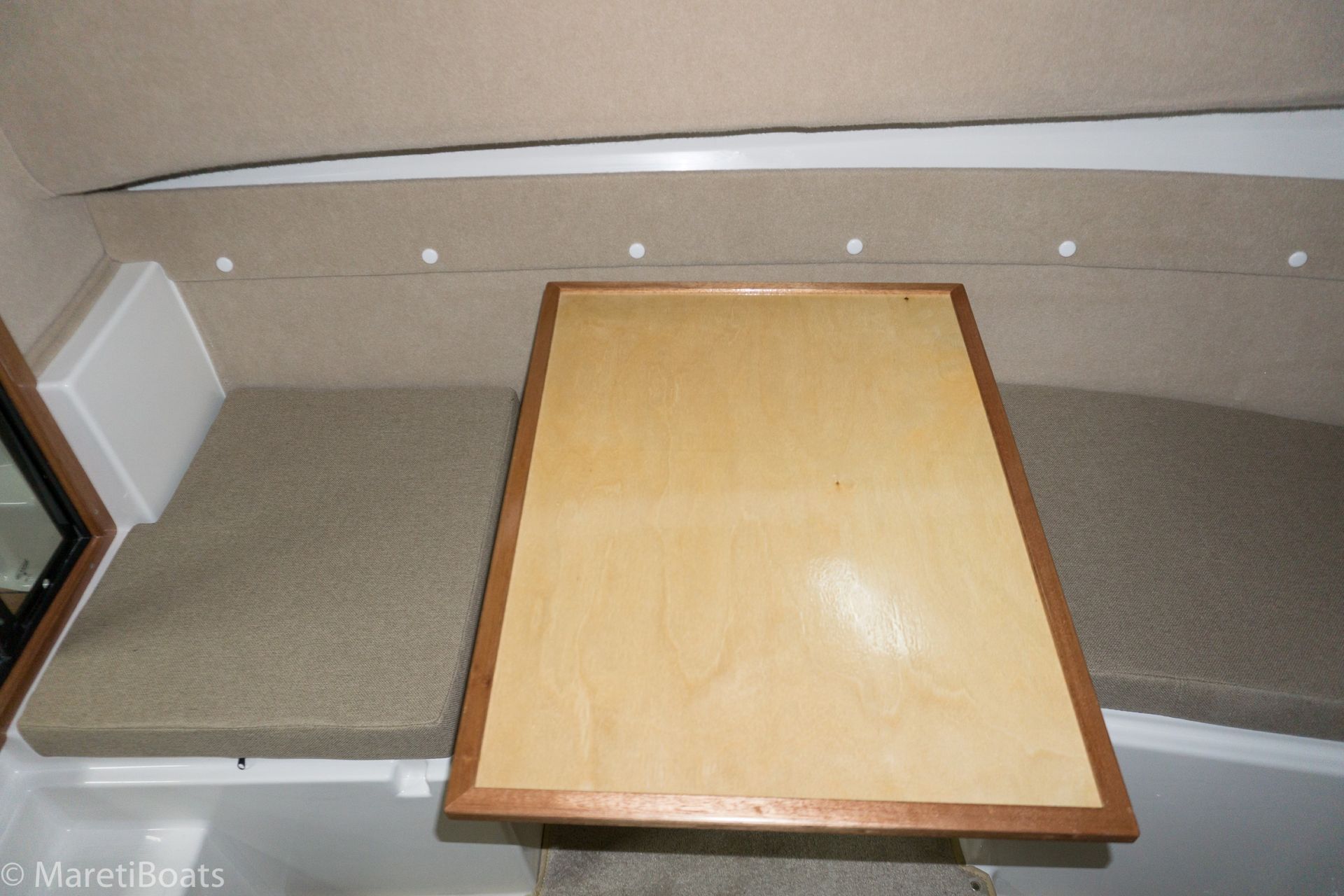 Su distribución se compone de un comedor completo en la banda de babor, formado por bancos de poliester en forma de L, que toma parte de la puerta, la banda completa de babor y parte de la popa. Estos bancos disponen de colchonetas asiento y cofres debajo para guarda y estiba de objetos diversos, en el centro de esta L, se monta la mesa con soporte telescópico, tiene doble uso como gran mesa para comidas y en posición baja forma un gran solárium, amplio, practico, comodo y muy cerca de la escalera de baño, Se pueden guardar todos los asientos y el solarium de proa en los cajones de estiba muy numerosos en esta nueva distribucion. Asi se puede lavar de restos de comida o pesca,