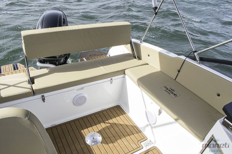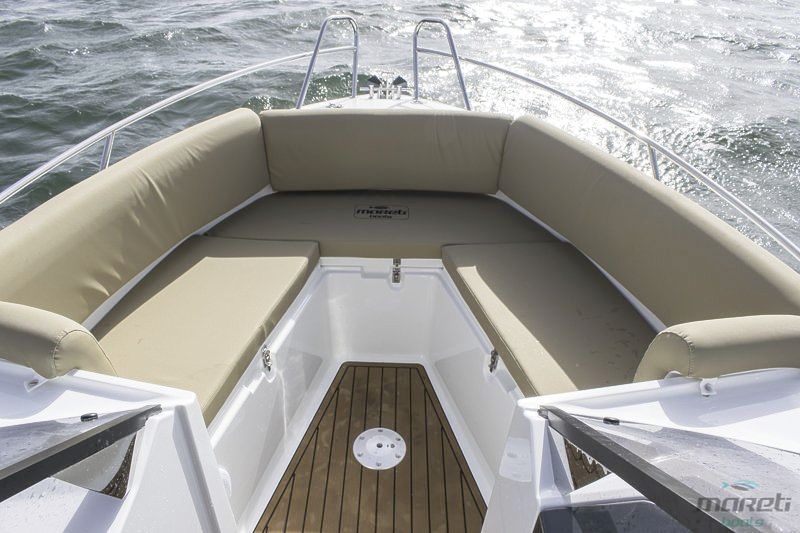 • 3 cornamusas de amarre • conjunto de barandillas inox • 3 cancamos de amarre • Puntera inox con roldana y sujeccion • Parabrisas de plexiglás con marco de aluminio • Sistema de dirección hidráulica, • Asiento del conductor • 7 cofres de estiba en el exterior • Lavabo laminado con grifo, • Cocina de inox • Compartimento con puerta laminada con WC químico • Instalacion electrica, • Panel de control • Luces de navegación • Sofá en L en la bañera • Mesa de proa con pie regulable, transformable en solarium • Plataforma a popa • Escalera de baño inox • Depósito de agua (50 l) • Bomba de achique automática • Depósito inox de combustible (110 l) • Tapon llenado de combustible,• Indicador de combustible • Bomba de agua . Anagramas Mareti