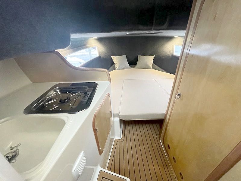 El interior de la Mareti 800 Cruiser es un deleite para los sentidos. La amplia cabina, que alberga un dormitorio lujoso, está diseñada pensando en el máximo confort. Los dos enormes ventanales situados a ambos costados inundan el espacio con luz natural, creando un ambiente luminoso y acogedor, perfecto para relajarte y descansar.