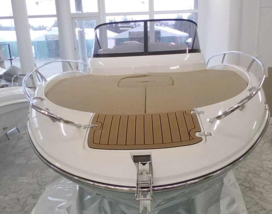 Bañera autovaciante con salidas laterales/Water outflow with return valves - Barandillas de inox largas de proa hasta bañera, con apertura especial a proa, para acceso/Long stainless steel railings from bow to cockpit, with special opening at the bow, for access - 4 Ba- randillas inox en el interior de las bandas de popa, practicas, ergonomicas y de fácil agarre y no molestan el paso/4 stainless steel hand- rails inside the stern bands, practical, ergonomic and easy to grip and do not interfere with passage - Consola con parabrisas con pasa- manos de aluminio /Console with windshield with aluminum handrails - Impresionante solárium completo en proa/ Impressive full sola- rium in the bow - Dos pasillos a ambos lados de cabina para acceso a solárium de proa/Two hallways on both sides of the cabin for access to the bow solarium - Solárium completo en popa / Full sundeck aft - Respaldo acolchado asiento de popa abatible, crea una extensión de solárium, hace mas grande el solá-rium de popa/Padded backrest folding aft seat, creates a solarium extension, makes the aft solarium larger - Salón completo en bañera con mesa regulable en altura y asientos en forma U/ Complete lounge in bathtub with height adjustable table and U shaped seats - Cáncamos de amarre /mooring eyebolts - Cuatro cornamusas inox de diseño/ Four de-signer stainless steel cleats - Dos cornamusas inox plegables, escamoteables, para amarre de spring/ Two folding, retractable stainless steel cleats for spring mooring - Cocina gas / Gas cooker - Modulo de poliéster a babor, para cocina, fregadero, etc/ Polyester module on port side, for kitchen, sink, etc. - Fregadero/Lavamanos en interior de cabina / Sink/washbasin inside the cabin - Frigorífico con con-gelador (ISOTERM) /Refrigerator with freezer (ISOTERM) - Ducha de agua dulce, en el costado trasero de babor/Fresh water shower, on the rear port side - Tapon boca llenado con llave, en regala de babor/ Filling mouth plug with key, on port gunwale - Bomba eléctrica de agua para fregadero y ducha/Electric water pump for sink and shower - WC completo independiente con puerta. Depósito de aguas negras y bomba residual / Independent full toilet with door. Black water tank and residual pump - Tapon waste en inox con llave para desague wc en regala de estribor/Stainless steel waste plug with key for toilet drain on the outer gunwale - Bomba sentina automática / automatic bilge pump - Escotilla en cabina sobre solárium/Cabin hatch over sundeck - Bandejas para estiba interior de cabina / Trays for interior cabin stowage - Tapicería interior cabina /Cabin interior upholstery - Paredes y techo interiores de cabina tapizados/Interior cabin walls and ceiling upholstered - Ventanas laterales con iluminación LED en contornos/Side windows with LED contour lighting -De-posito combustible inox de 250L (instalación completa) con sensor y nivel indicador / Fuel tank 250L (complete instalation) with a sensor and level indicator - Cierre completo cabina con puerta corredera / Com-plete closing cabin with sliding door - Dirección hi-dráulica para 300cv / Hydraulic steering for 300cv - Plata-formas de popa/ Stern platforms - Extension plataformas de baño adosadas/Ex-tension attached bathing plat- forms - Escalera de baño empotrada en extension plataforma de estribor/Bathroom ladder built into star-board platform extension - Asiento piloto deportivo con doble posición leaningpost/Sports pilot seat with dual position leaning post - Cofre de anclas con tapa, cierre con ojo para candado, y desague/ Anchor chest with lid, closure with padlock eye, and drain - Gran cofre en suelo bañera, para facil acceso a tanque carburan-te y pertrechos grandes, con dos cierres/Large locker on the cockpit floor, for easy access to the fuel tank and large supplies,with two locks - Cofre amplio bajo asiento de popa con cierre/ Large locker under stern seat with closure - Dos cofres con cierres inox muy reforzados, en ambas plataformas de baño/ Two chests with highly reinforced stain-less steel closures, on both bathing platforms - Pieza central plataforma baño semicir-cular en poliester, rodeando el motor,para paso de babor a estribor, elevable con amortiguador telescopico / Central piece semicircular bath platform in polyester, surrounding the engine, for passage from port to star-board, elevatable with telescopic shock absorber - Luces navegación LED con panel de interruptores (con instalación eléctrica completa) /Navigation lights with switch panel (with complete electrical installation) - Me sa madera en bañera /Table outside - Mesa de madera maciza en interior cabina / Solid wood table in cabin in-terior - Bomba autovaciante / Automatic bilge pump