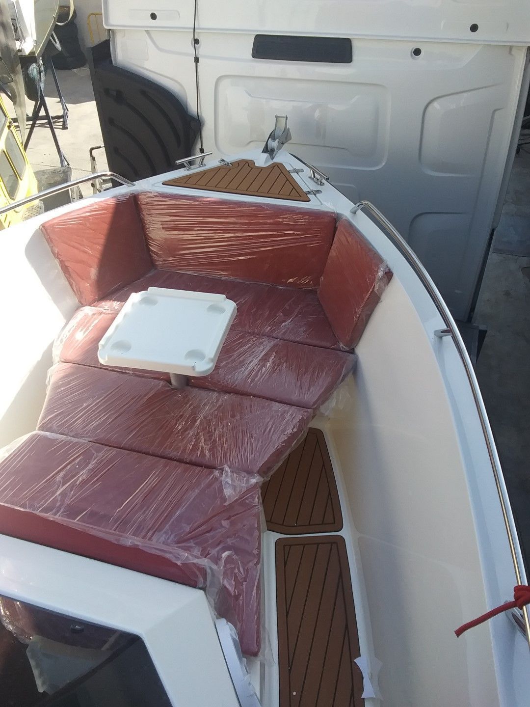 - Roda de proa protegida con chapa acero inox/ Bow wheel protected with stainless steel sheet - Asiento delan-tero en bañera de proa, con cajon, para estiba diversa/ Front seat in bow cockpit, with drawer, for various stowage
